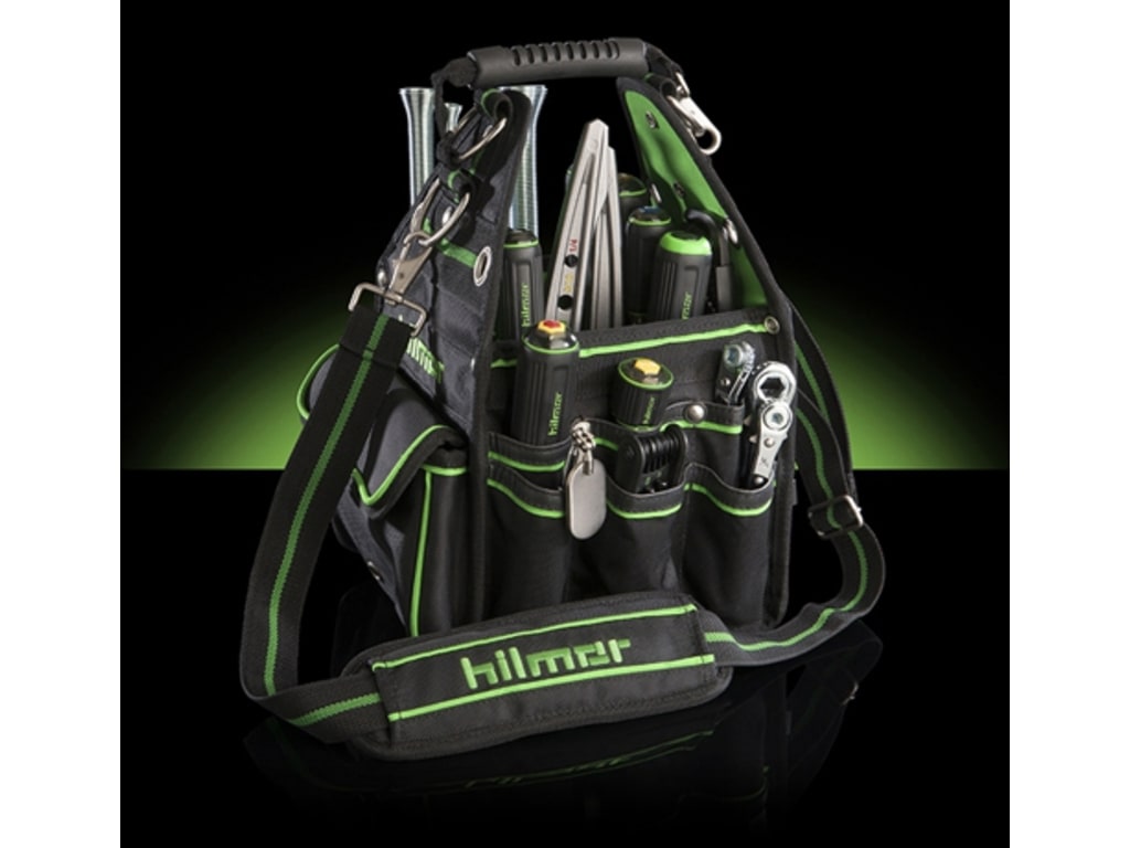 The hilmor HVAC/R Tote is your go-to tool storage and transport solution. It includes 27 exterior and interior pockets, 18 elastic bands and clips for your keys so you can store your tools safely and find them quickly. Plus, an interior padded pocket provides safe storage for your meter. Its sturdy water-resistant bottom means rain or shine, the contents inside won't be damaged. Plus, the reinforced rivets mean it's built to last. And while it's spacious enough to hold up to 50 lbs., a padded shoulder strap makes carrying a little more comfortable.